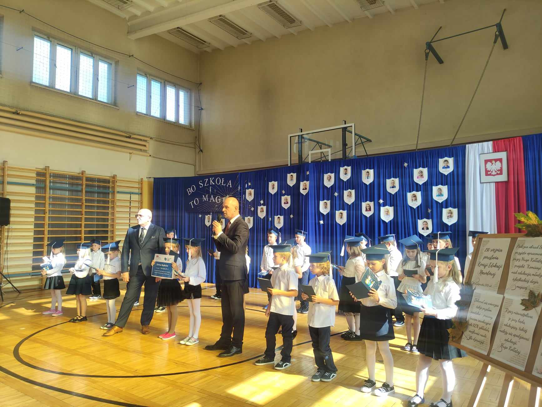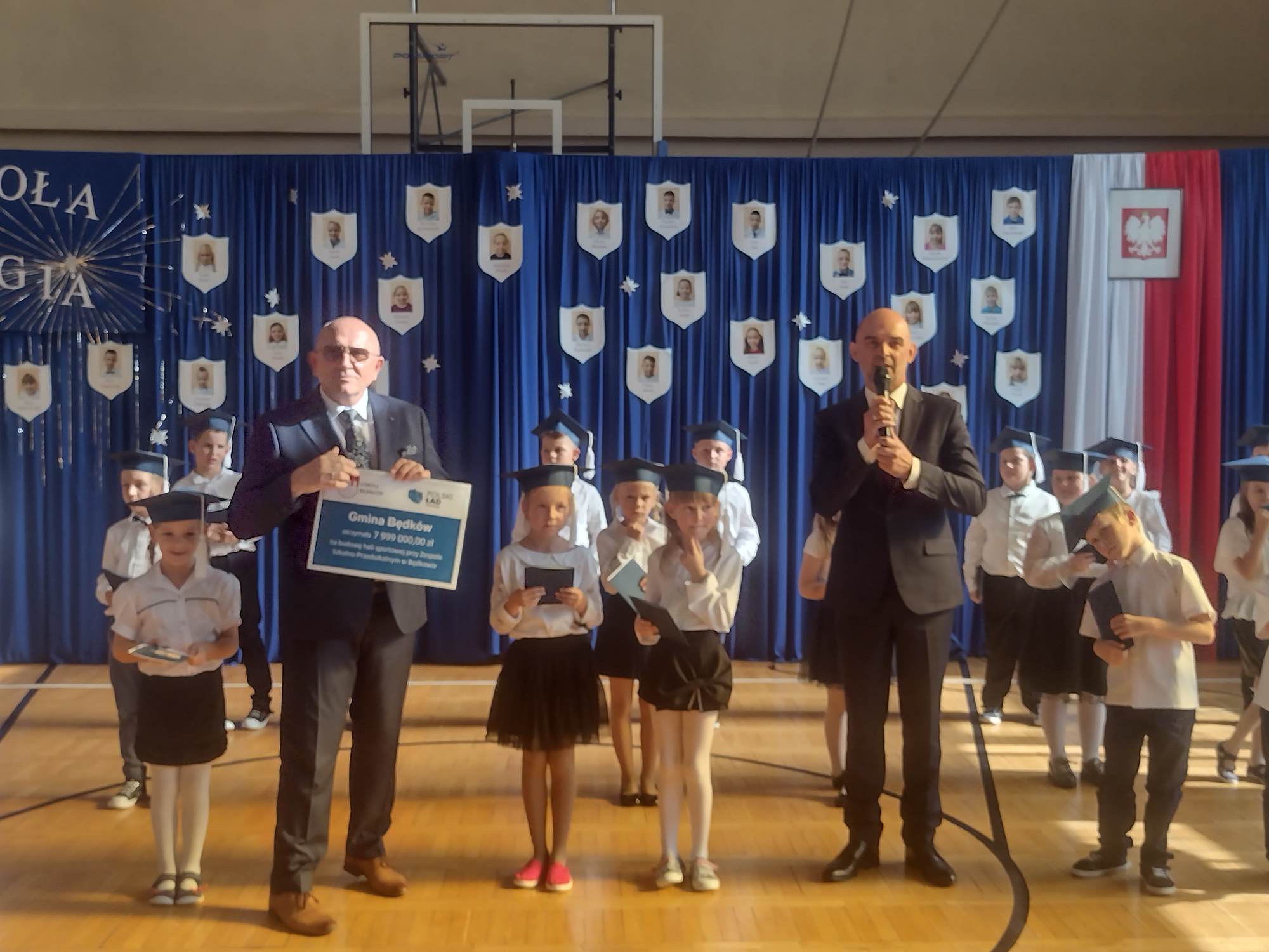 13 października br. odbyły się uroczyste obchody 250. rocznicy utworzenia Komisji Edukacji Narodowej oraz pasowanie na pierwszoklasistów. Szczególny charakter uroczystości nadali obecni goście: pracownicy Urzędu Gminy z Panem Wójtem Dariuszem Misztalem, emeryci oraz rodzice uczniów klas pierwszych. Pan Wójt w swoim przemówieniu zwrócił uwagę na pionierstwo utworzonej w 1773 roku Komisji Edukacji Narodowej, której celem było stworzenie systemu edukacji dostępnego dla wszystkich obywateli, niezależnie od pochodzenia czy statusu społecznego. Następnie Pan Wójt Dariusz Misztal wraz z Panem Dyrektorem Szkoły Andrzejem Szklarkiem wręczyli nauczycielom i pracownikom szkoły okolicznościowe nagrody w podziękowaniu za ogrom pracy wkładany nie tylko w nauczanie i wychowanie młodego pokolenia, ale również doskonałe funkcjonowanie placówki. Po części oficjalnej z programem artystycznym wystąpili uczniowie klas 0 - III. Piękna dekoracja, ciekawy koncert życzeń i papierowe kwiaty wręczane wraz z życzeniami od Samorządu Szkolnego wprowadziły wszystkich w doskonały nastrój. Następnie odbyło się uroczyste pasowanie pierwszaków na uczniów szkoły w Będkowie. Pan Wójt wręczył dzieciom ich pierwszy dokument: legitymację szkolną. Po uroczystości uczniowie klas pierwszych wraz z wychowawczyniami udali się do sali lekcyjnej, gdzie dzięki pomysłowości Rodziców świętowanie było niezwykłe. Zabawne zdjęcia na ściance i pyszny tort idealnie pasowały do hasła klasowej imprezy: „Bo szkoła to magia”. Na koniec Pan Wójt przekazał wszystkim wspaniałą wiadomość o pozyskaniu kwoty w wysokości 7 999 000 zł na budowę nowej hali sportowej i na ręce uczniów oraz Pana Dyrektora złożył symboliczny czek. Pieniądze na ten cel Gmina Będków pozyskała z Rządowego Programu Inwestycji Strategicznych Polski Ład.