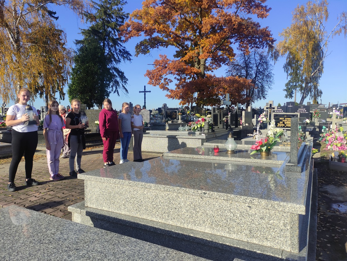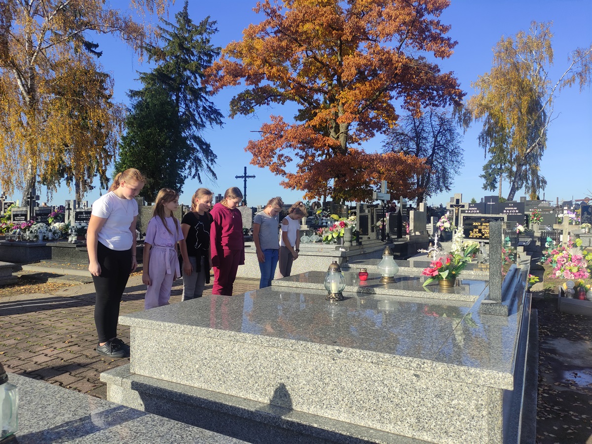 30 października w przededniu Święta Zmarłych uczennice klasy piątej posprzątały groby żołnierzy z I i II wojny światowej. Zagrabiły liście, umyły płyty, zapaliły znicze, oddając hołd poległym w obronie Ojczyzny. Społeczność szkolna, wraz z opiekunkami Samorządu Uczniowskiego panią Bogusławą Wochną i panią Agatą Karlińską, pamiętała również o zmarłych nauczycielach, na grobach których również zapalono światełka pamięci. Początek listopada to dobry czas na chwilę refleksji i zadumy nad przemijającym czasem.
