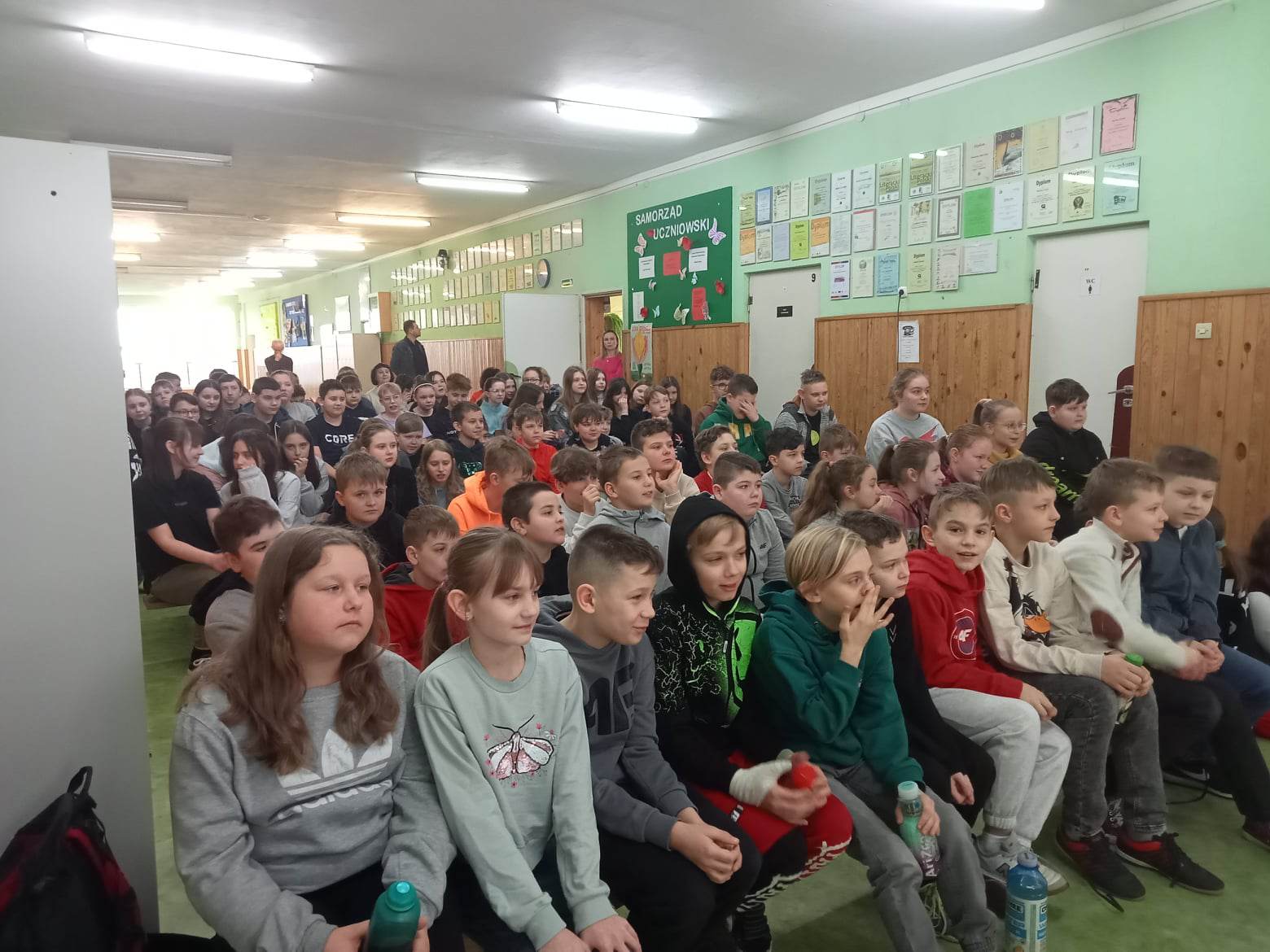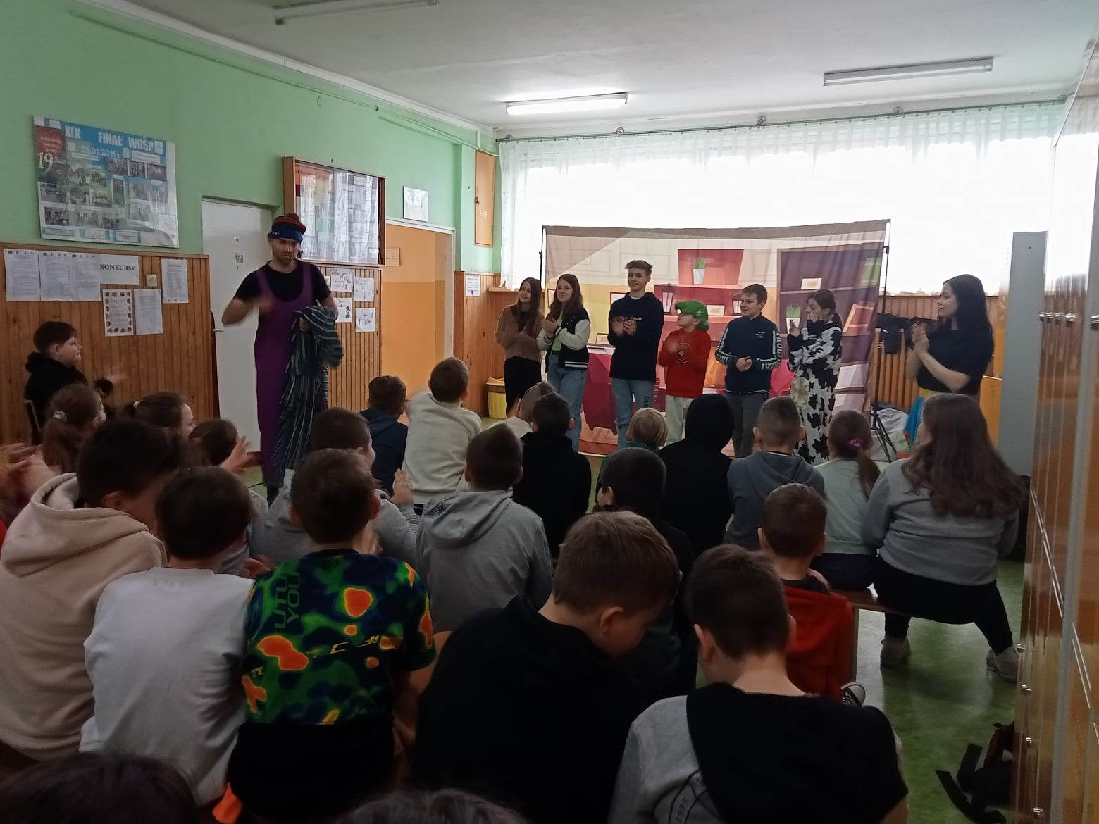 W poniedziałek 13 marca naszą szkołę odwiedzili aktorzy z Grupy T z Torunia. Zaprezentowali oni dwa spektakle profilaktyczne. Pierwszy, zatytułowany Wielka ucieczka, przeznaczony był dla uczniów klas IV – VIII. Celem sztuki było uświadomienie widzom, jakie konsekwencje niesie ze sobą sięganie po używki i niezdrowe napoje. Poruszony został także problem zaburzenia hierarchii wartości i osamotnienia osób starszych.