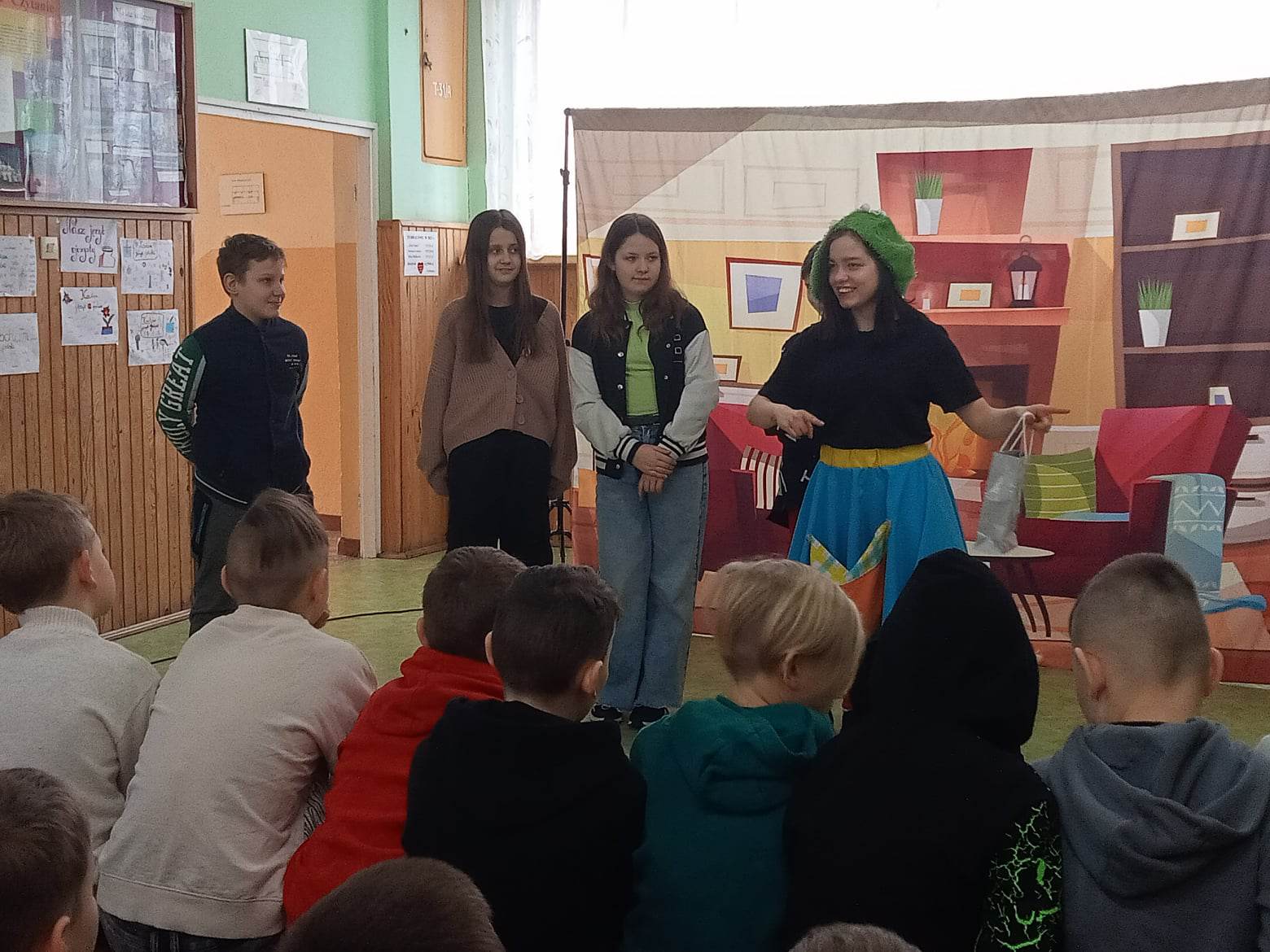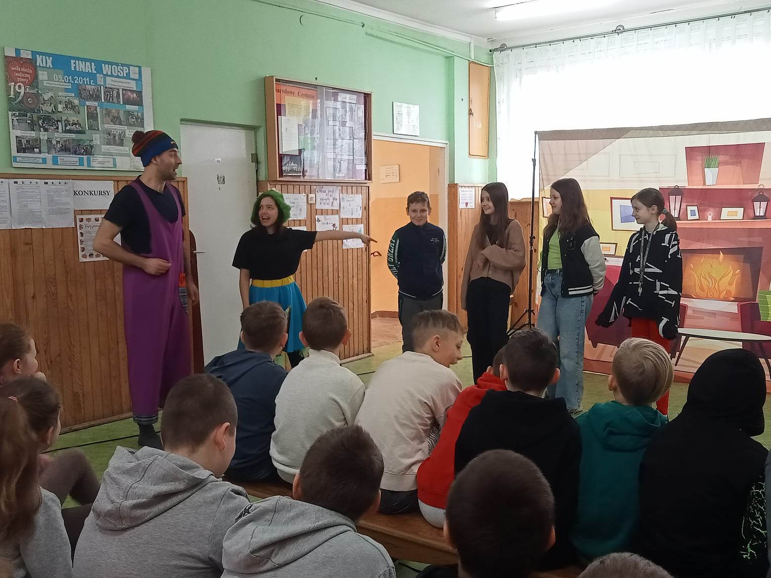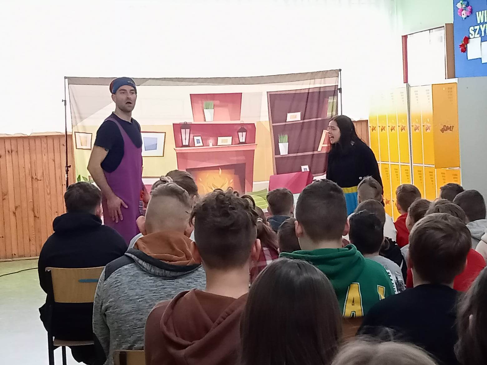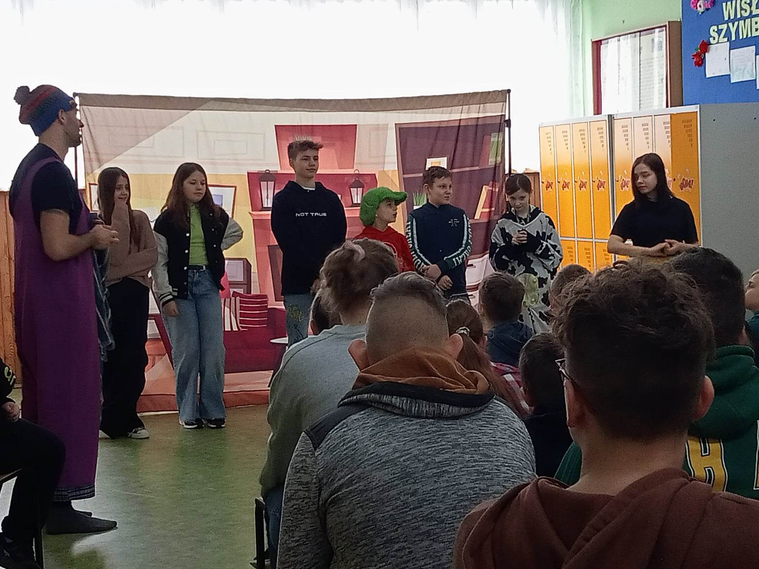 Najmłodsi uczniowie z klas 0 – III obejrzeli Bajki na jednej nodze. Przedstawienie poświęcone było uzależnieniom od alkoholu i narkotyków. Aktorzy pokazywali alternatywny model życia, w którym zdrowe odżywianie się i zachowanie higieny może zmienić życie młodych ludzi na lepsze.