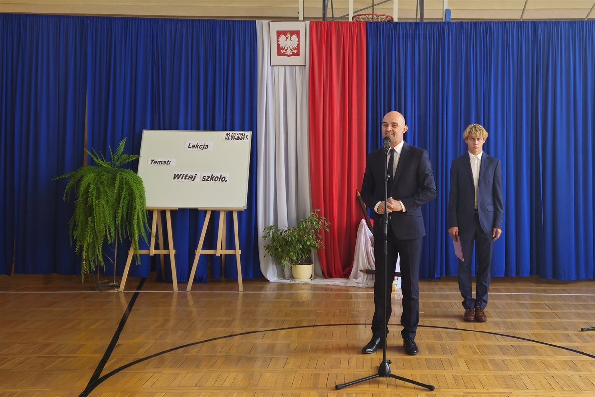 Pan Dyrektor Andrzej Szklarek serdecznie powitał uczniów i przypomniał, że 85 lat temu uczniowie nie mogli iść do szkoły, ponieważ 1 IX 1939 r. wybuchła II wojna światowa.