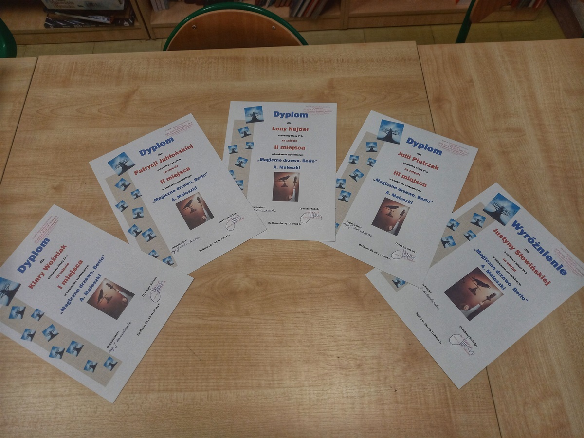 25 listopada 2024 r. został rozstrzygnięty konkurs czytelniczy zorganizowany przez bibliotekę szkolną. Już po raz dziewiąty uczniowie klas IV-VI uczestniczyli w zmaganiach konkursowych mających na celu wyłonić czytelników, którzy mogli poszczycić się doskonałą znajomością treści książek z serii „Magiczne drzewo” Andrzeja Maleszki. W tym roku szkolnym uczniowie zapoznali się z przygodami bohaterów opisanymi w tomie 9. zatytułowanym „Berło”. Uczestnicy  konkursu wykazali się duchem rywalizacji oraz ogromną znajomością treści książki. Wśród nagrodzonych oraz wyróżnionych w konkursie znaleźli się:
