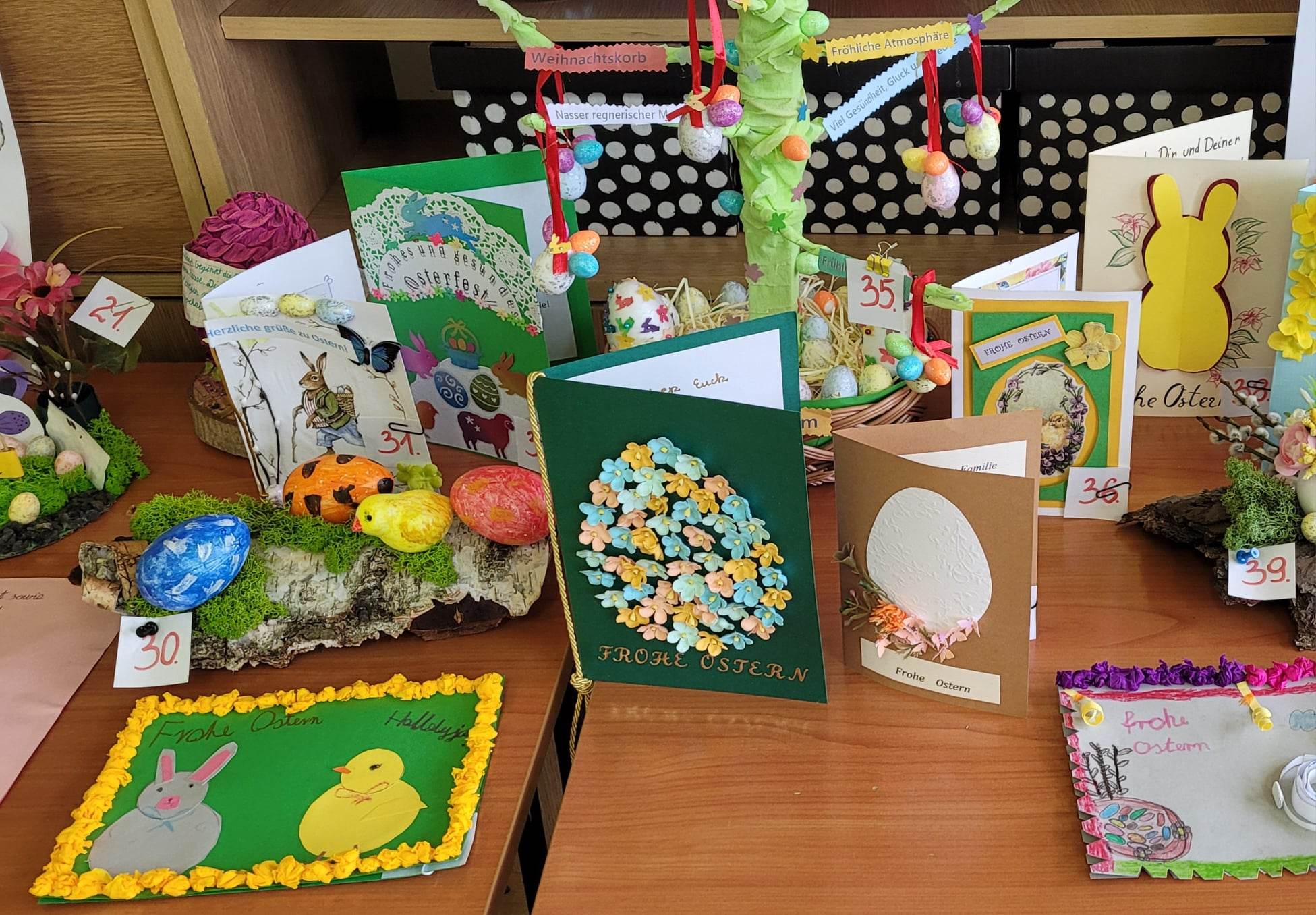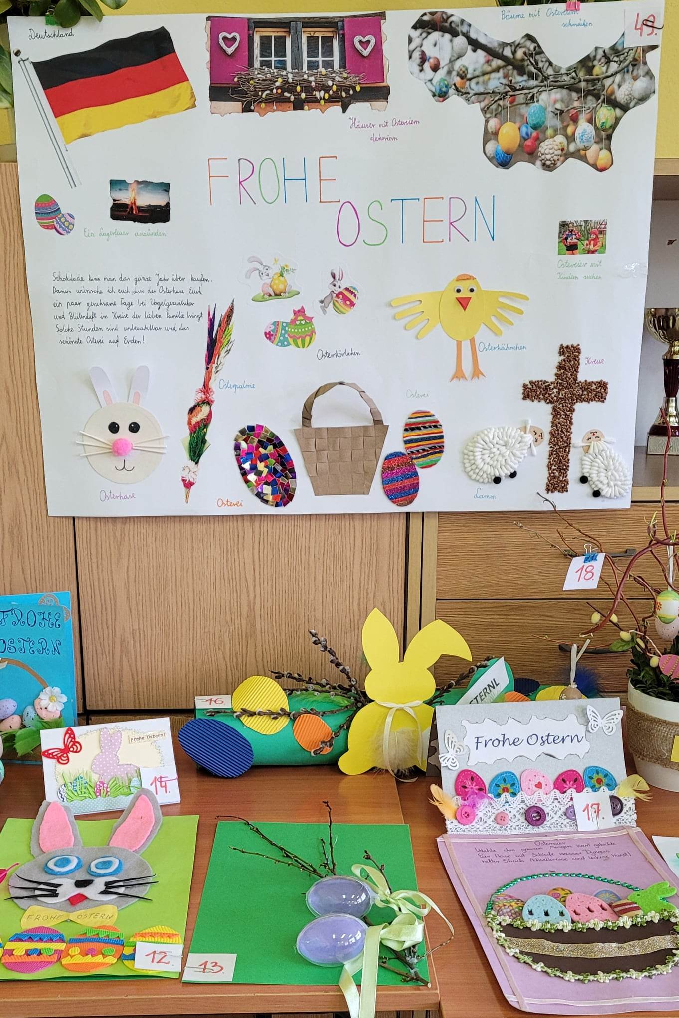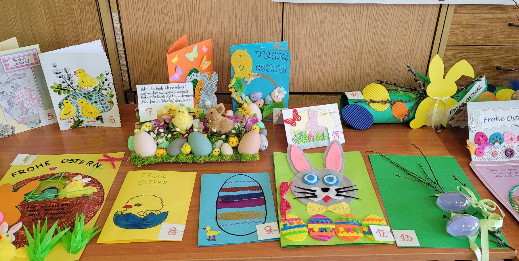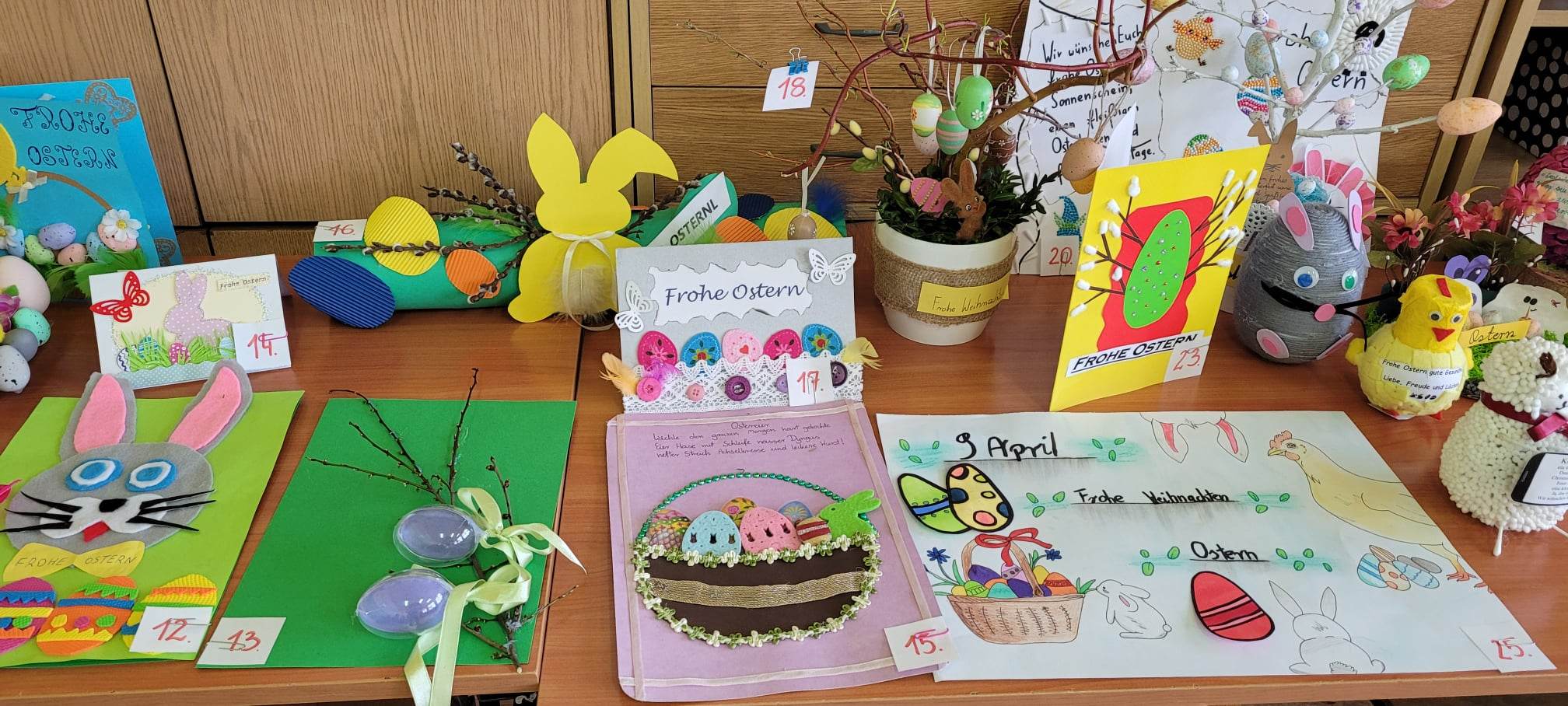 Z okazji świąt wielkanocnych został zorganizowany konkurs plastyczny Wielkanoc w Niemczech „Frohe Ostern”. Celem konkursu było rozwijanie zainteresowania językiem niemieckim i kulturą Niemiec oraz zachęcenie do rozwijania zdolności plastycznych i manualnych. Konkurs cieszył się dużym zainteresowaniem. W  konkursie więło udział 49 prac uczniów klas IV – VIII. Prace zostały wykonane za pomocą różnych technik. Uczniowie wykazali się dużą kreatywnością  i pomysłowością, a komisja konkursowa miała nie lada wyzwanie. Po długich naradach jury konkursowe wybrało trzy zwycięskie prace.