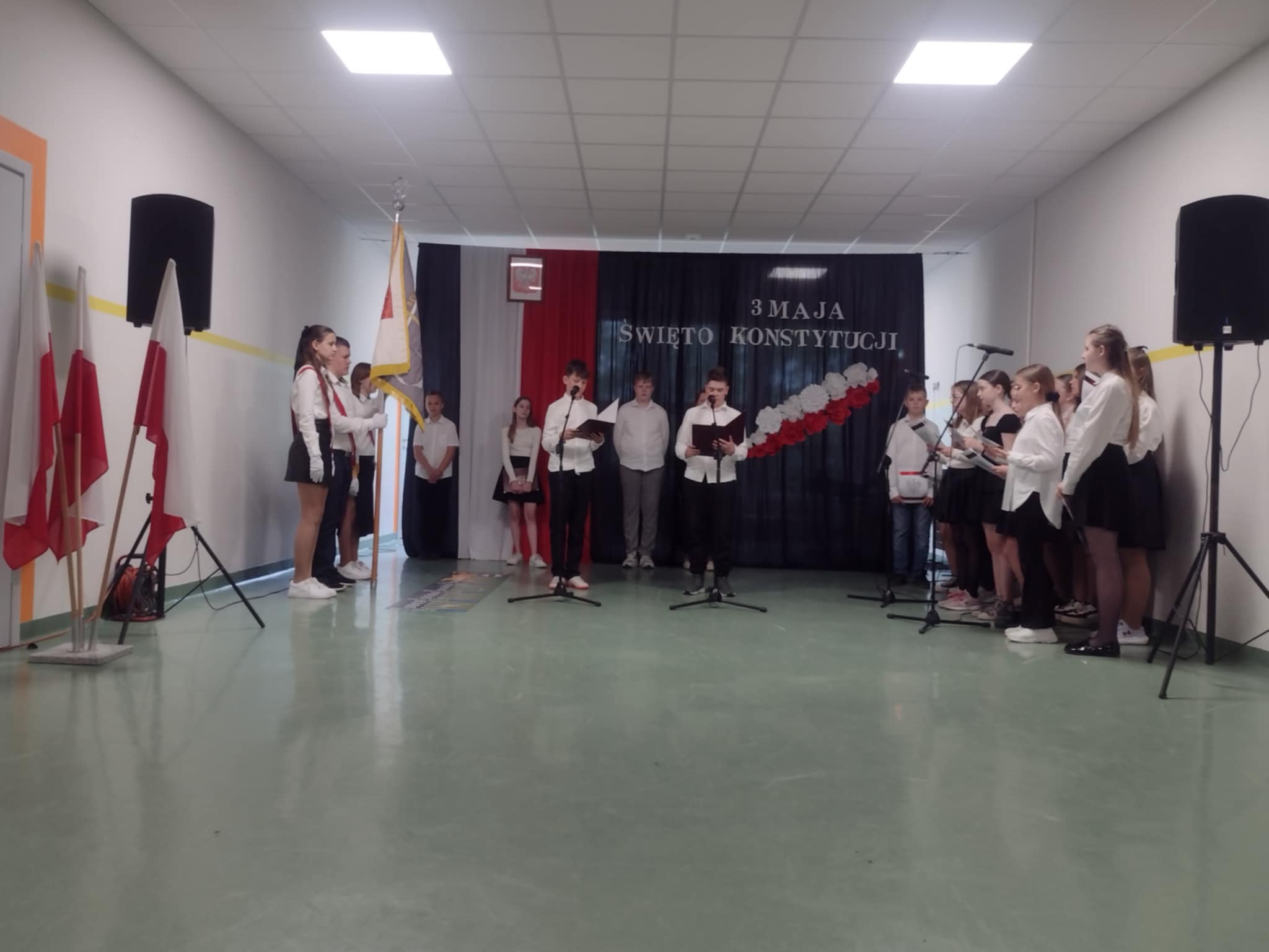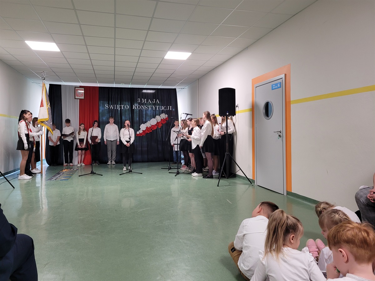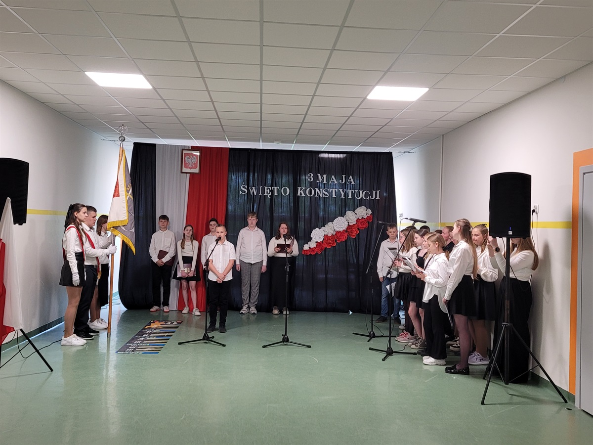 Przygotowani przez Panią Anetę Chrustowską i Pana Andrzeja Legiezińskiego uczniowie klasy VIA przybliżyli zebranym tło historyczne oraz zapisy ustawy z 3 V 1791 r. Ich występ urozmaicony był okolicznościowymi piosenkami w wykonaniu chóru szkolnego.