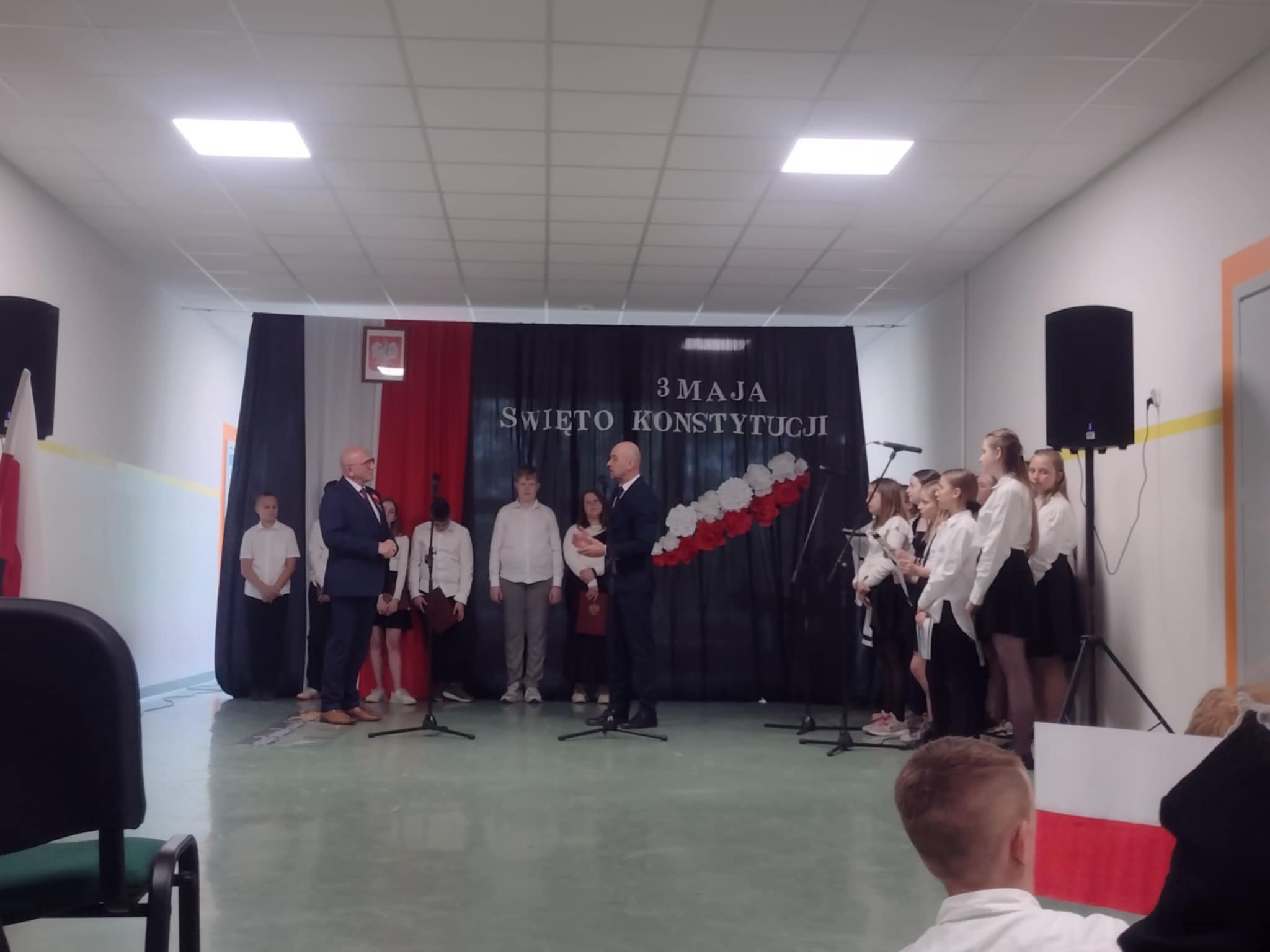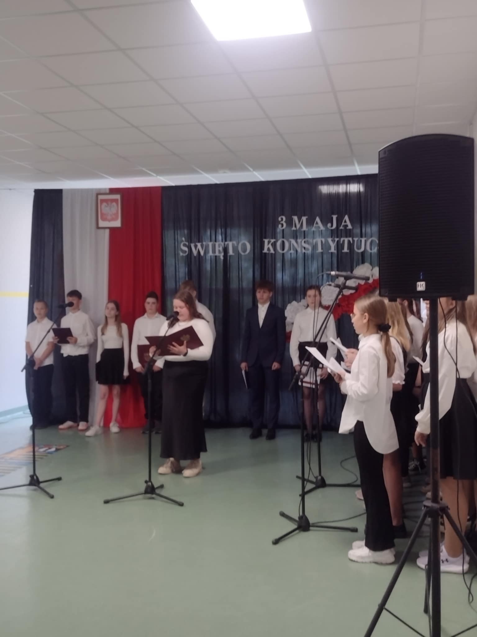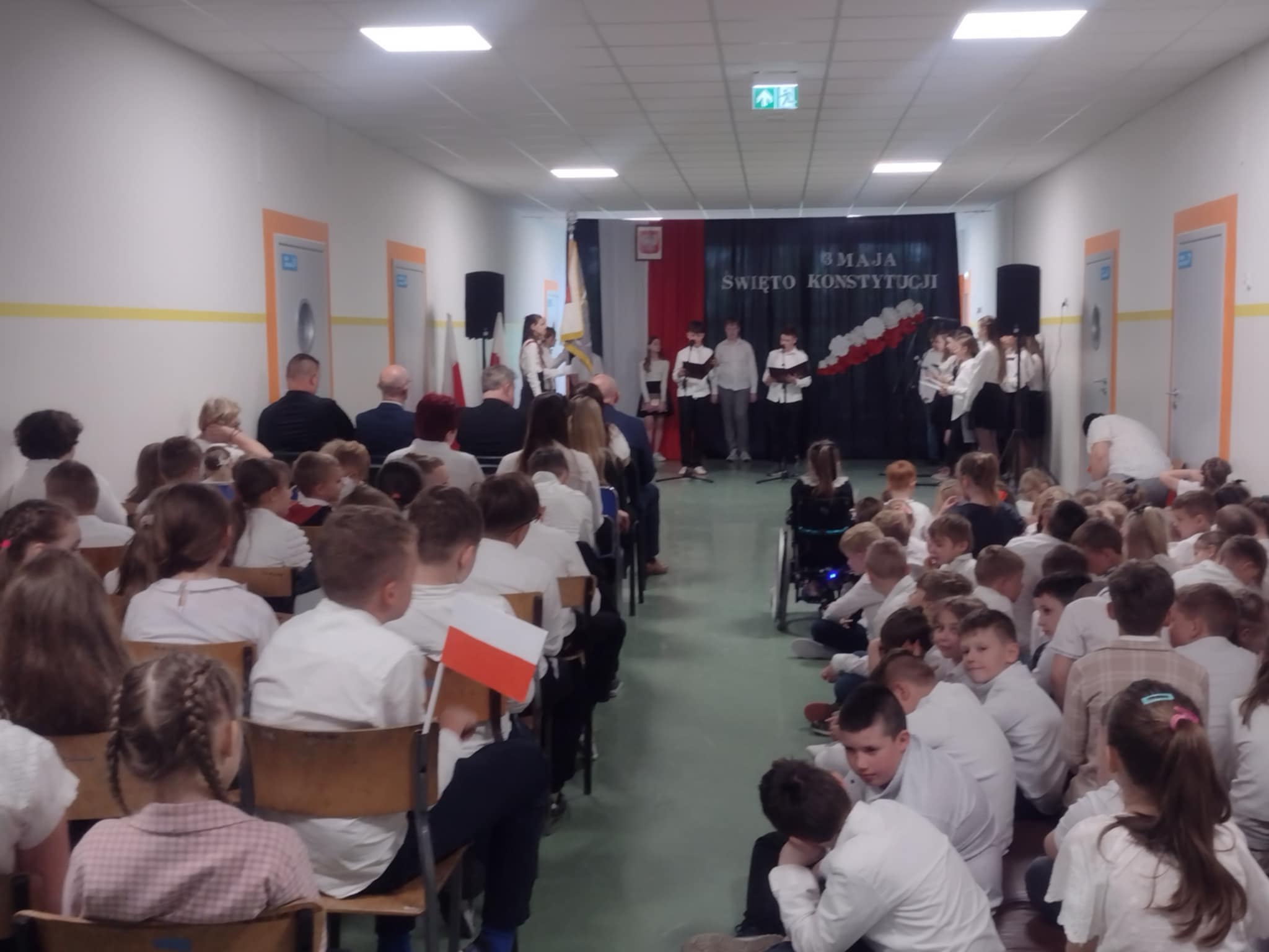 Przygotowani przez Panią Anetę Chrustowską i Pana Andrzeja Legiezińskiego uczniowie klasy VIA przybliżyli zebranym tło historyczne oraz zapisy ustawy z 3 V 1791 r. Ich występ urozmaicony był okolicznościowymi piosenkami w wykonaniu chóru szkolnego.