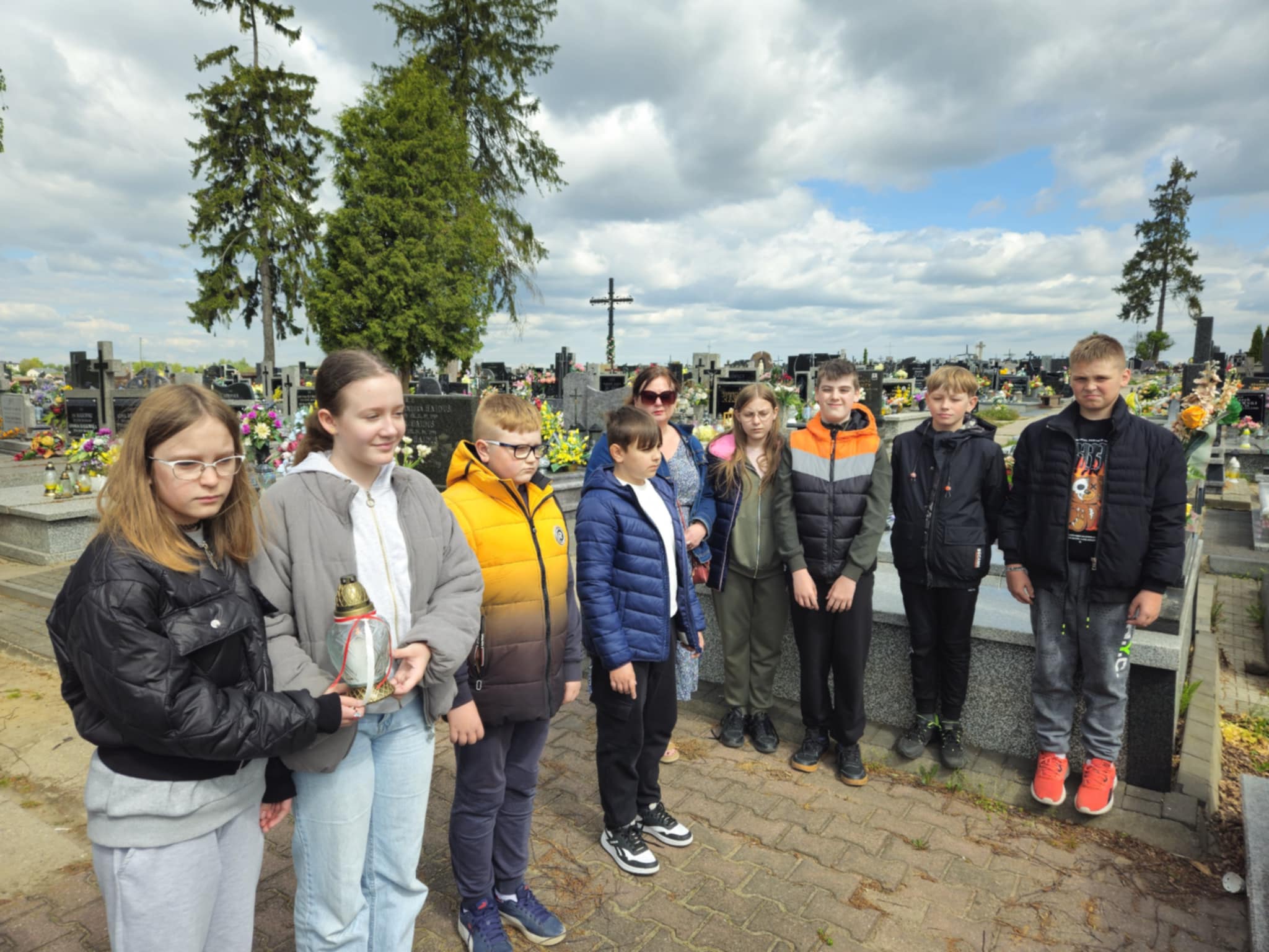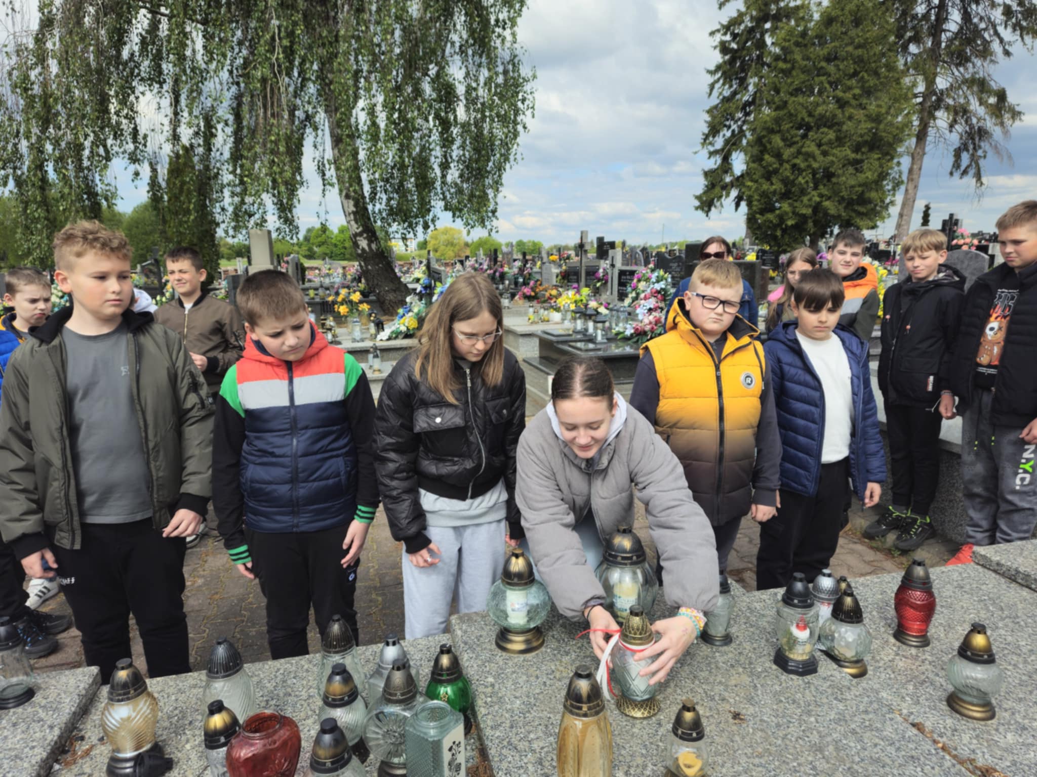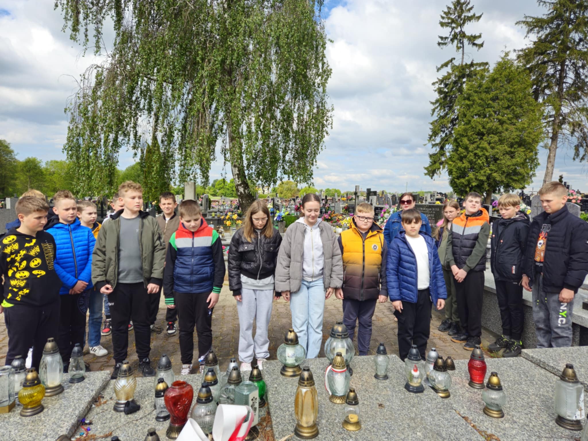 W 80. rocznicę zakończenia II wojny światowej delegacja Samorządu Uczniowskiego wraz z opiekunami Panią Agatą Karlińską i Panem Andrzejem Legiezińskim złożyła hołd pomordowanym przez III Rzeszę żołnierzom oraz mieszkańcom naszej gminy. Na parafialnym cmentarzu na grobach obrońców ojczyzny oraz przed tablicą pamięci zapalono znicze. Pan Andrzej Legieziński w krótkim wystąpieniu opowiedział o II wojnie światowej, uwzględniając lokalną historię. Obserwujący to wydarzenie mieszkańcy gminy z uznaniem wypowiadali się na temat propagowania wśród uczniów postaw patriotycznych.