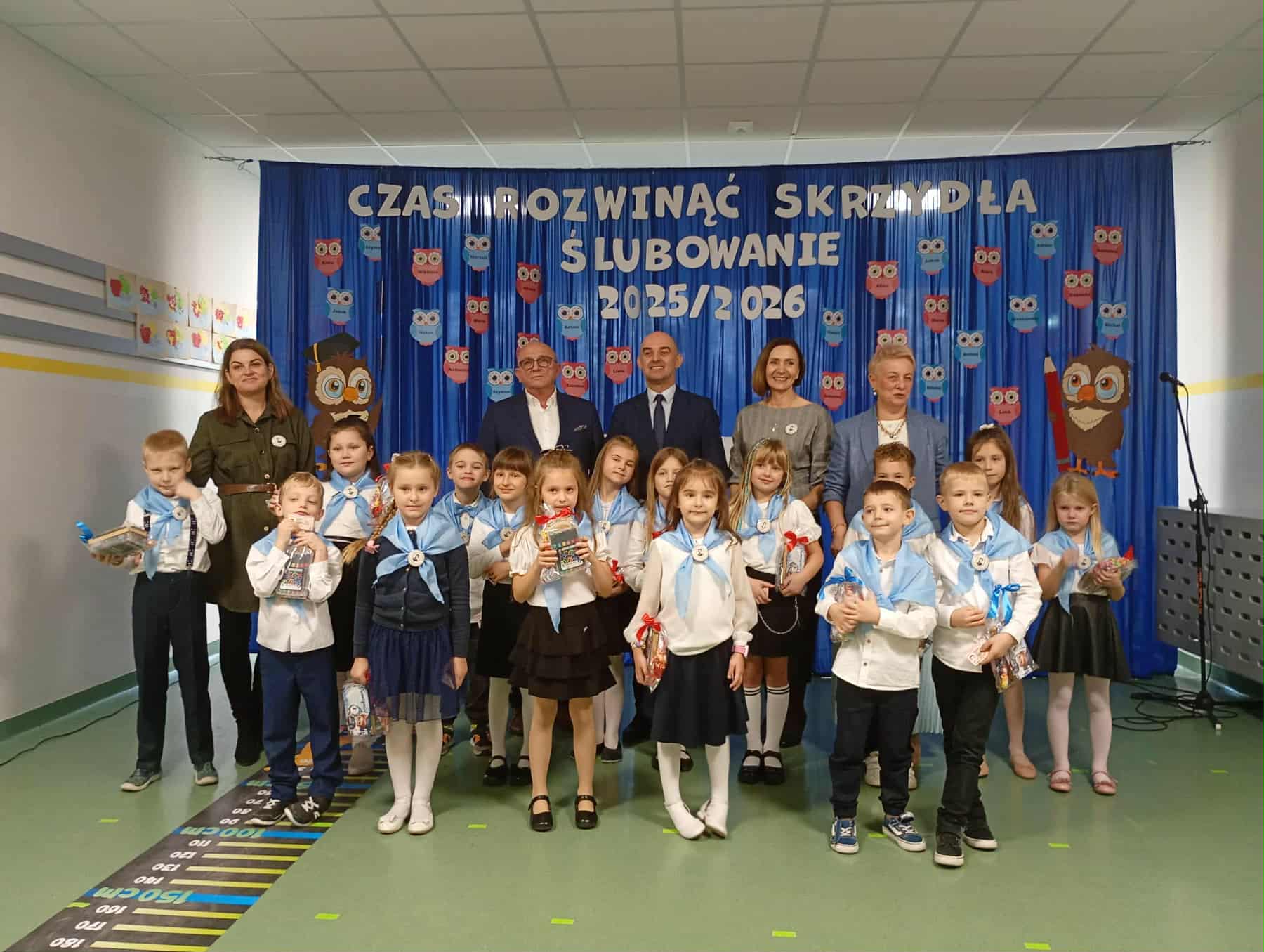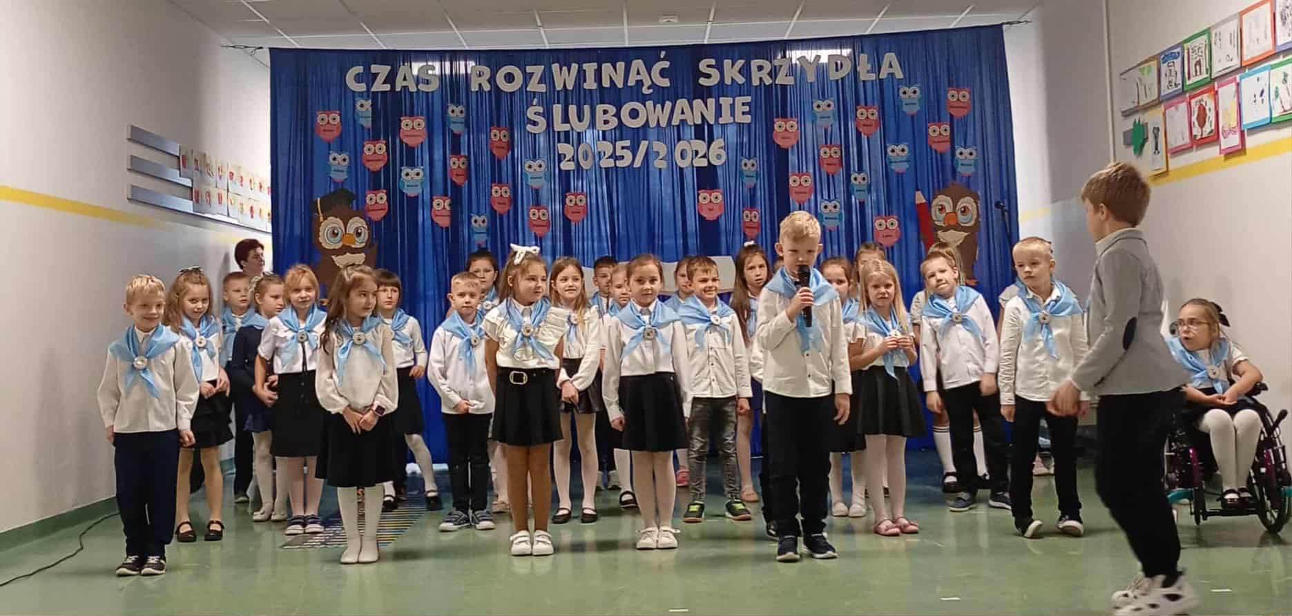24 października w naszej szkole odbyła się uroczystość ślubowania i pasowania na uczniów klas pierwszych.  W uczniowskie szeregi oficjalnie wstąpiło 32 pierwszoklasistów w chustach z nadrukiem patrona naszej szkoły - W.S. Reymonta oraz z emblematami szkoły (logo), ufundowanymi  przez Radę Rodziców. W obecności rodziców, dyrekcji szkoły oraz  zaproszonych gości:  Pana Wójta Gminy  Dariusza Misztala, przewodniczącej RG  Pani Karoliny Rauch oraz przedstawiciela Rady Rodziców Pani  Ilony Bogusławskiej i innych gości uczniowie zaprezentowali swoje zdolności artystyczne. Był to  najważniejszy i długo wyczekiwany  dzień w życiu każdego pierwszaka, a wydarzeniu towarzyszyło  wiele emocji zarówno wśród uczniów, nauczycieli, a także rodziców.  Nie zabrakło uśmiechów, łez, wzruszeń oraz uczucia dumy. Teraz przed Nimi długa droga nauki, nowych obowiązków. W tej drodze zawsze mogą liczyć na pomoc rodziców, nauczycieli i swoich starszych kolegów.