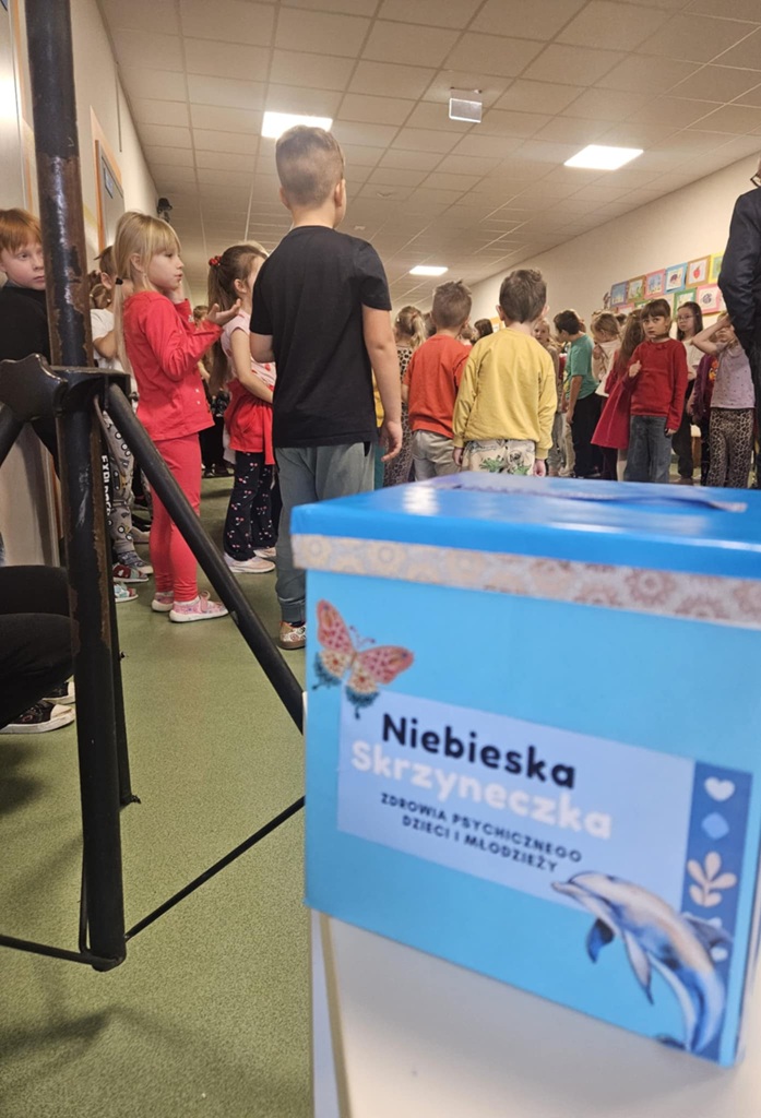 Uroczyście rozpoczęliśmy również ogólnopolską akcję „Niebieska Skrzyneczka Zdrowia Psychicznego Dzieci i Młodzieży”. Skrzyneczka w kolorze niebieskim to miejsce, gdzie możemy, jako członkowie społeczności szkolnej, podzielić się naszymi troskami, obawami lub prośbą o pomoc. To kolejny akcent, który ma wesprzeć naszych podopiecznych w trudnościach i problemach towarzyszących ich rozwojowi.