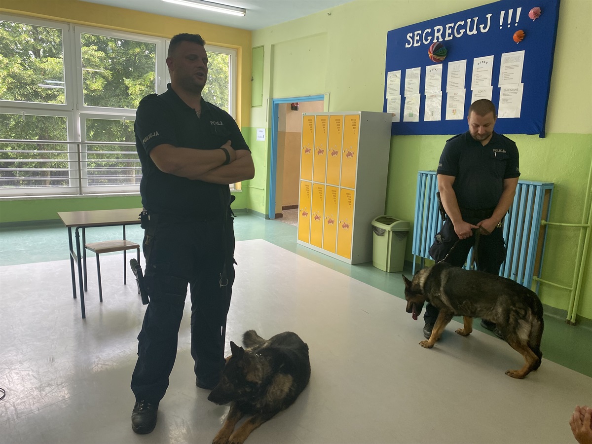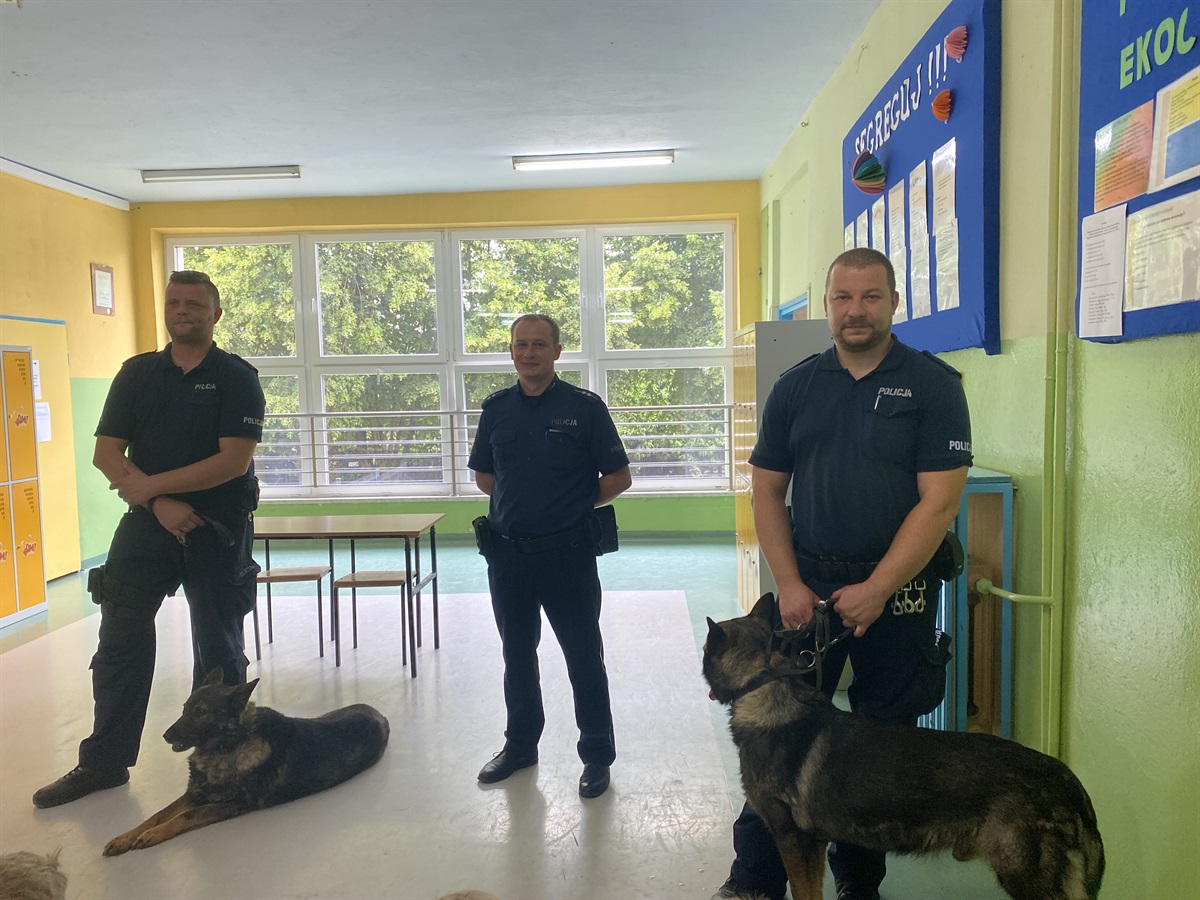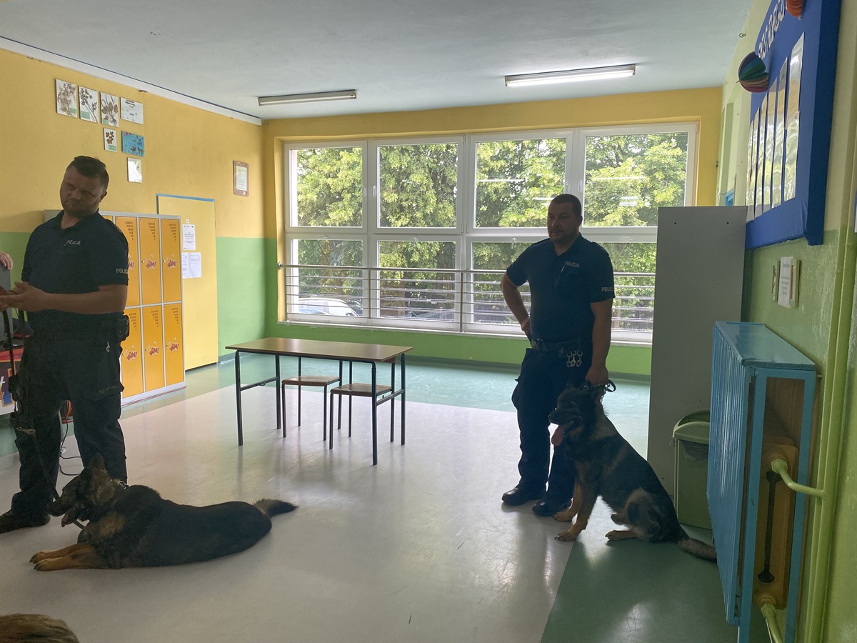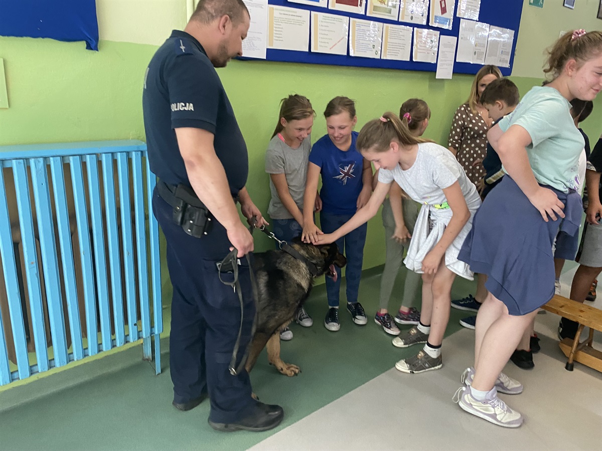 w czasie wakacji. Goście odpowiedzieli na zadawane przez uczniów pytania dotyczące postaw i zachowań. Wielką furorę zrobili funkcjonariusze z psami. Uczestnicy spotkania zostali poinstruowani jak zachować się w przypadku napadu psa.