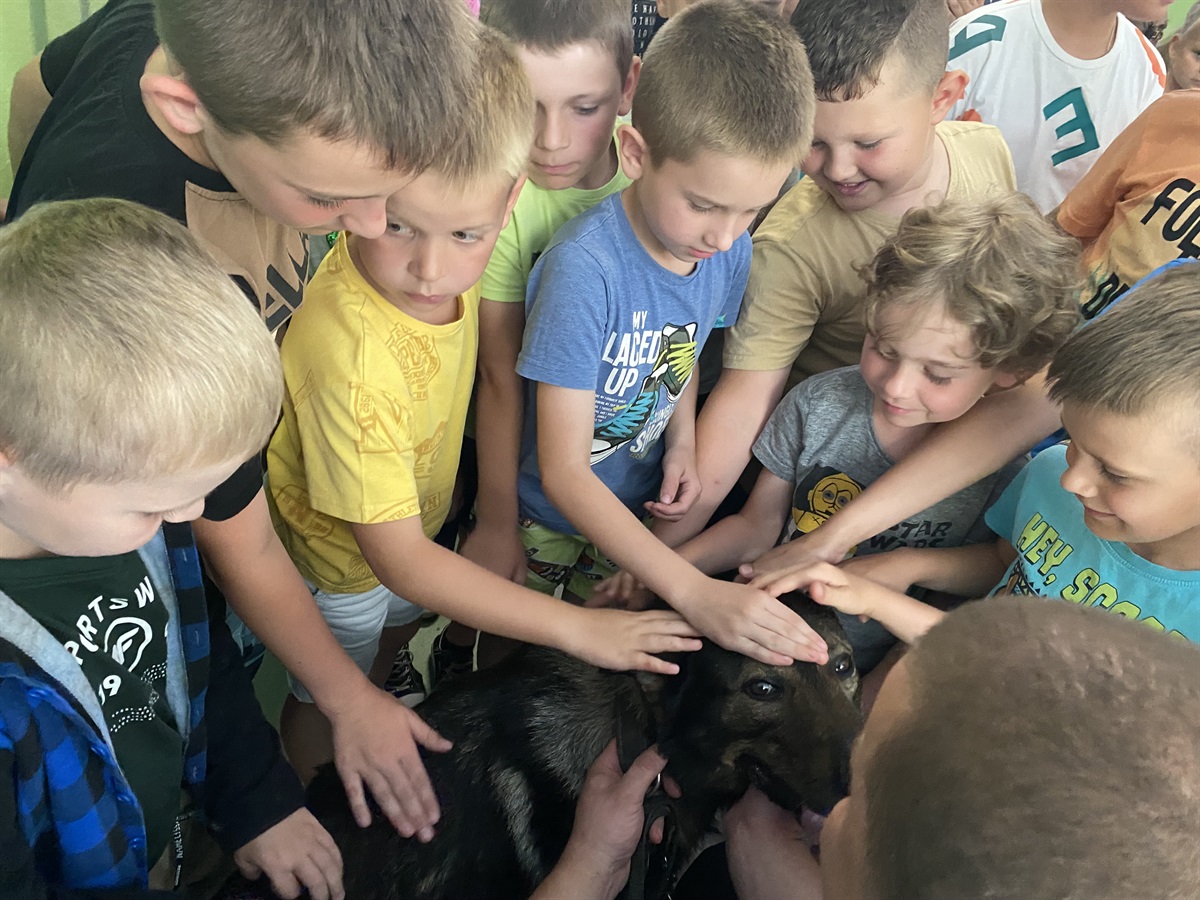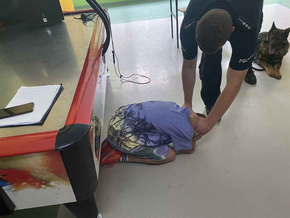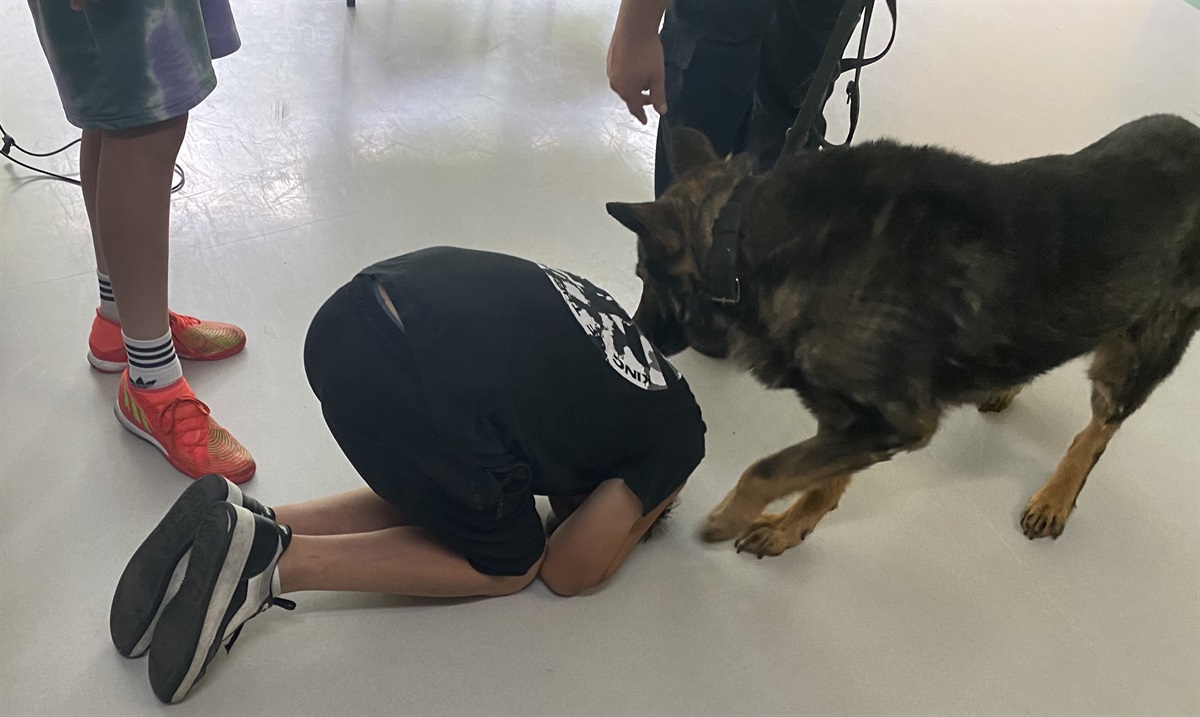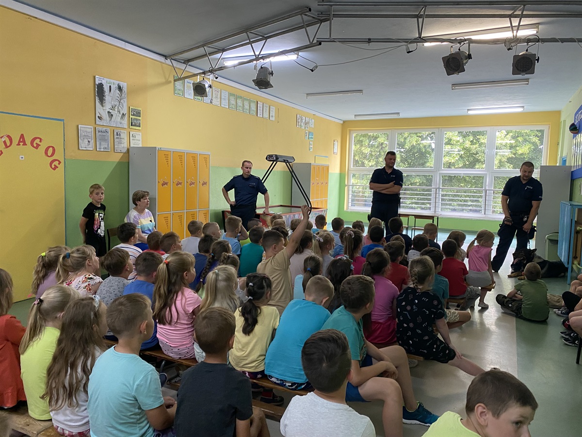 w czasie wakacji. Goście odpowiedzieli na zadawane przez uczniów pytania dotyczące postaw i zachowań. Wielką furorę zrobili funkcjonariusze z psami. Uczestnicy spotkania zostali poinstruowani jak zachować się w przypadku napadu psa.