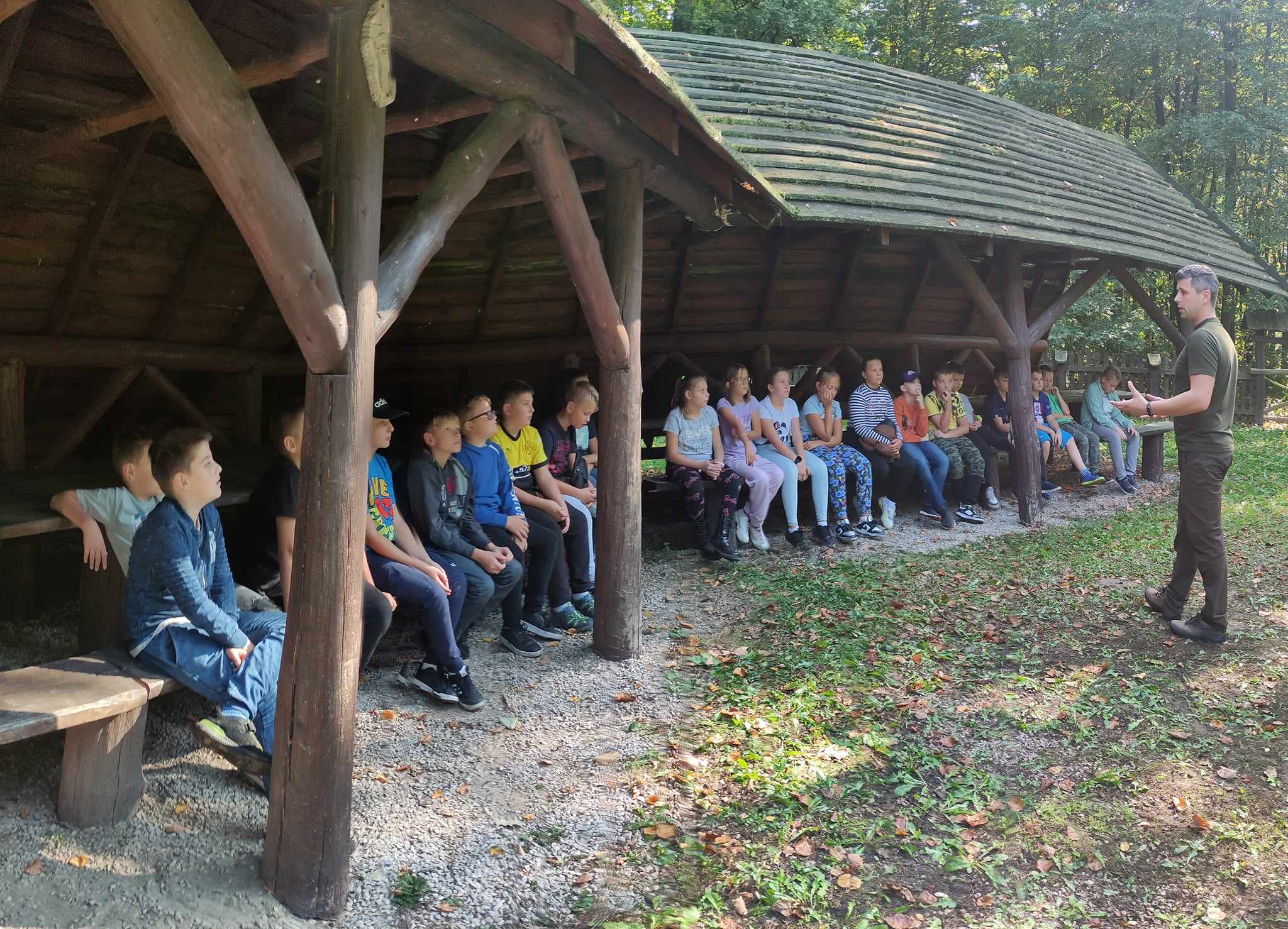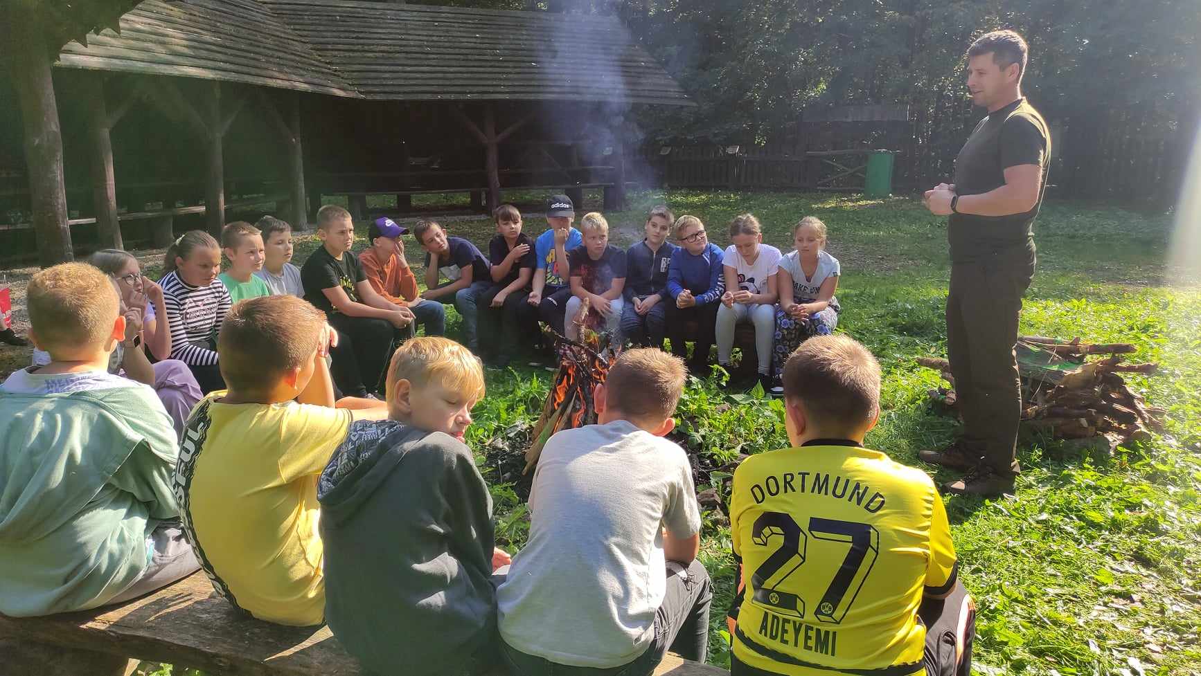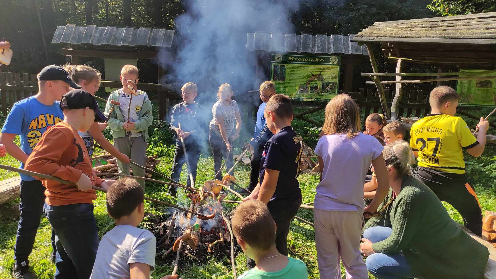 W dniu 27 września 2023 roku uczniowie klasy czwartej wraz z wychowawczynią panią Agatą Karlińską mieli okazję do niezwykłego spotkania z leśniczym oraz fascynującymi opowieściami o zwierzętach. Pod wiatą edukacyjną w Żywocinie leśniczy pan Grzegorz Marczyński podzielił się swoją wiedzą i doświadczeniem z zakresu ochrony przyrody. Uczniowie byli oczarowani jego opowieściami o różnorodności zwierząt i roślin występujących w okolicy, a także dowiedzieli się, jak dbać o otaczający nas świat. Leśniczy dzielił się swoją wiedzą na temat różnorodności przyrody, zachęcając uczniów do odkrywania i szanowania otaczającego ich środowiska. Spotkanie było doskonałą okazją do zapoznania się z różnymi gatunkami drzew i zwierząt, a także do zrozumienia, jak ważne jest zachowanie równowagi w przyrodzie. Dzieci chętnie zadawały pytania i uczestniczyły w dyskusji na temat ekologii i roli człowieka w ekosystemie. Dużo dowiedziały się też o zbiornikach retencyjnych. Pan leśniczy pomógł uczniom zrozumieć, jak ważne jest działanie na rzecz ochrony przyrody. Na zakończenie niezwykłego dnia odbyło się ognisko z kiełbaskami.